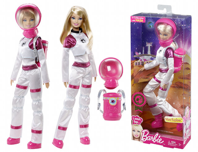 Look, I can appreciate the lame attempt to showcase a Barbie doll in a job that is still, essentially, a boys club career , but when you tart the doll up, stuff her in a sparkly pink outfit and slather her in make-up and then tell little girls that she's an Astronaut, you're doing a disservice to the women who are ACTUAL astronauts.